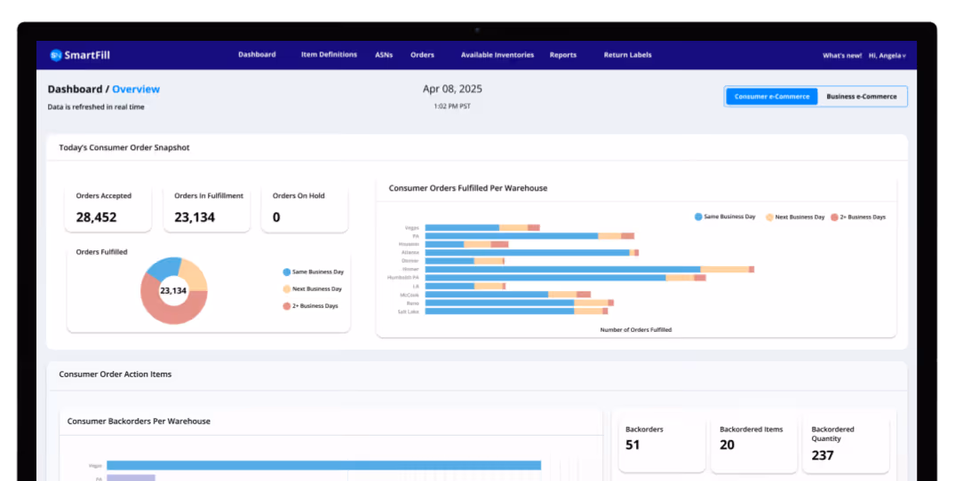 The latest version of SmartFill introduces a brand-new dashboard experience with real-time auto-refreshing data, filterable views by warehouse and date, and expanded insights for shipping, fulfillment, receiving, and returns. You can now manage backorders, exceptions, and restock needs right from the dashboard.
